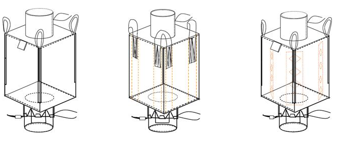 一,集裝袋的結(jié)構(gòu)樣式主要有3種,從左到右依次為U型片設(shè)計(jì)、圓筒型設(shè)計(jì)、隔板型設(shè)計(jì)。